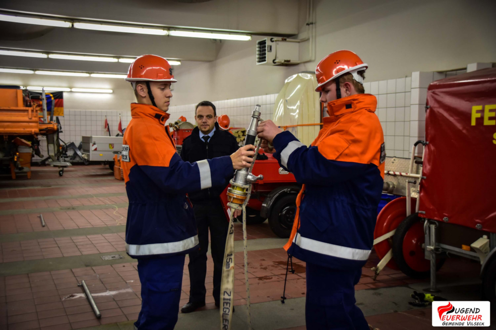 Am Samstag, den 11. November veranstaltete die Jugendfeuerwehr Gemeinde Vilseck ihren ersten Berufsfeuerwehrtag auf Gemeindeebene. Insgesamt 22 Jugendliche, sowie deren Ausbilder begannen pünktlich um 8 Uhr bei der „Berufsfeuerwehr der Gemeindejugend Vilseck“ ihren Dienst im Gerätehaus Vilseck. Nach einer kurzen Begrüßung durch Gemeindejugendwart Andreas Männer wurden die Jugendlichen auf die verschiedenen Fahrzeuge aufgeteilt und durften ihre Spinde beziehen. Um 9 Uhr startete die Abnahme der Jugendflamme Stufe 1 durch unsere Ausbilder.Diese wurde gegen 10 Uhr durch den ersten Einsatz unterbrochen. Nach ertönen des Alarmgongs und der Durchsage „Kleintierrettung in Axtheid-Berg“ eilten die Jugendlichen zu ihren Fahrzeugen und rückten mit dem HLF (Vilseck), dem LF 16 (Schlicht), MLF (Sorghof) und dem TSF (Schönlind, später Gressenwöhr) aus. Am Einsatzort wurde schnell die Lage erkundet und das hilflose Tier mit Hilfe einer Steckleiter gerettet. Zurück am Gerätehaus wurde nach einer kurzen Pause die Abnahme fortgeführt. Bei dem anschließenden gemeinsamen Essen fassen konnten sich die Jugendlichen für den weiteren Tag stärken. Nach der Mittagspause übten die Feuerwehranwärter gerade für die Bayrische Jugendspange, als erneut der Alarmgong mit der Durchsage „Brand einer Lagerhalle“ ertönte.Unverzüglich rückten die Nachwuchskräfte mit Blaulicht und Martinshorn zur Einsatzstelle aus. Schon bei der Anfahrt war der Einsatzort aufgrund der Rauchentwicklung und der Flammen ersichtlich. Vor Ort fanden die Feuerwehrler einen großen brennenden Holzhaufen vor. Sofort nach dem Eintreffen wurden durch den Befehl des Gruppenführers zwei B-Leitungen von einem Hydranten und einem offenen Gewässer zum HLF verlegt und mit der Brandbekämpfung begonnen. Um den Jugendlichen die verschiedenen Stationen und Aufgaben am Einsatzort zu veranschaulichen, wurde kurz „Wasser halt“ gegeben und die einzelnen Stationen gemeinsam erkundet.Nachdem das Feuer abgelöscht wurde, kehrten die Einsatzkräfte ins Gerätehaus zurück und stellten die Einsatzbereitschaft wieder her. An eine Pause war jedoch noch lange nicht zu denken, da die Abnahme der Bayerischen Jugendspange auf dem Programm stand. Nach Ende der Abnahme gab es für unsere Jugendlichen Abendessen. Doch auch diese Ruhe dauerte nicht lange an, da sie zu einer Nachsicht alarmiert wurden, welche sich als Fehlalarm herausstellte. Danach war Freizeit angesagt, in der sich die Jugendlichen mit Spielen, Kicker und vielen mehr beschäftigten.Gegen 22 Uhr wurden die Floriansjünger zu einer ausgelösten Brandmeldeanlage (BMA) zur Mittelschule Vilseck alarmiert. Die dortige Kulisse wurde für das obligatorisches Gruppenfoto genutzt, ehe die Nachtruhe einkehrte.Gegen 7:30 Uhr wurde diese durch den letzten Einsatz beendet. Hier waren die Jugendlichen noch einmal bei einer Verkehrsabsicherung gefordert. Das anschließend gemeinsame Frühstück beendete dann offiziell den Berufsfeuerwehrtag 2017.Ein großer Dank gilt allen Jugendwarten, Ausbildern, Maschinisten und Helfern, die uns so tatkräftig unterstützt haben, sowie unserem Webmaster Michael Lang, der unseren Berufsfeuerwehrtag mit Foto- und Videokamera begleitet hat.Das Team der „Jugendfeuerwehr Gemeinde Vilseck“ und alle Jugendlichen haben dazu beigetragen, dass dieser Tag so viel Spaß gemacht hat und ein voller Erfolg wurde! DANKE!Bildergalerie Berufsfeuerwehrtag 2017Autor: Daniel Ritz